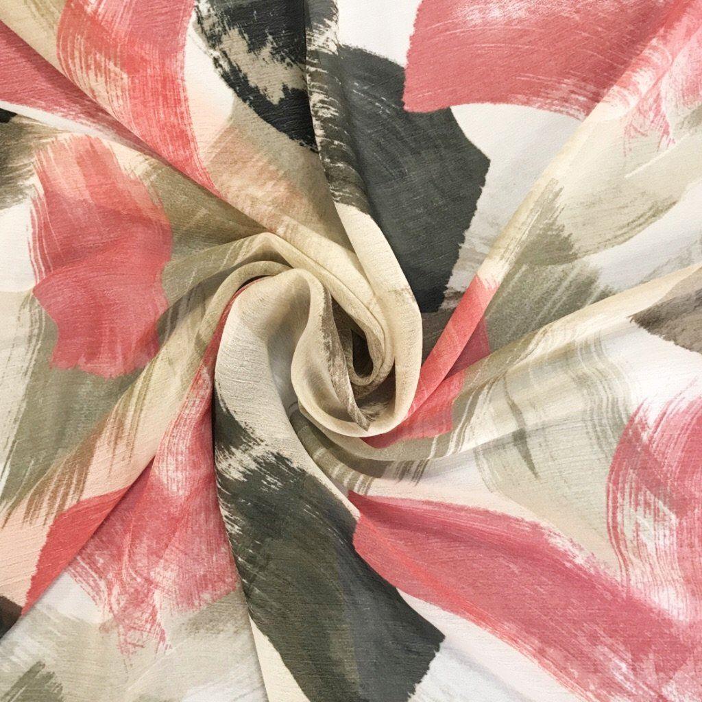 This lightweight chiffon fabric features a pink, black and grey paint brush pattern. It features a crinkle effect and is suitable for blouses, tops, dresses, skirts, scarves, accessories and more.