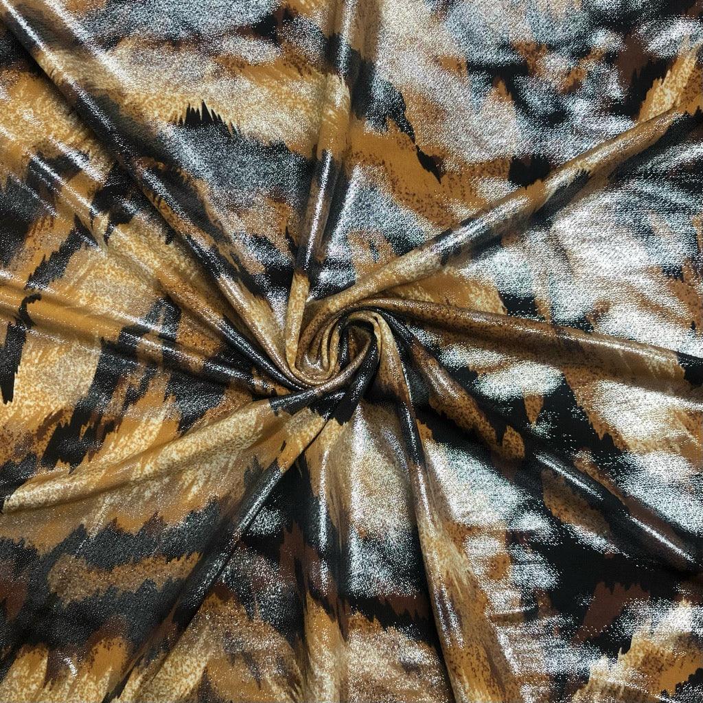 A 4 way stretch elastane fabric featuring a tiger design. This would be perfect for a range of uses, including leggings, dresses, accessories and more. The foil on this fabric gives the fabric a sheen and a glitter look appearance.