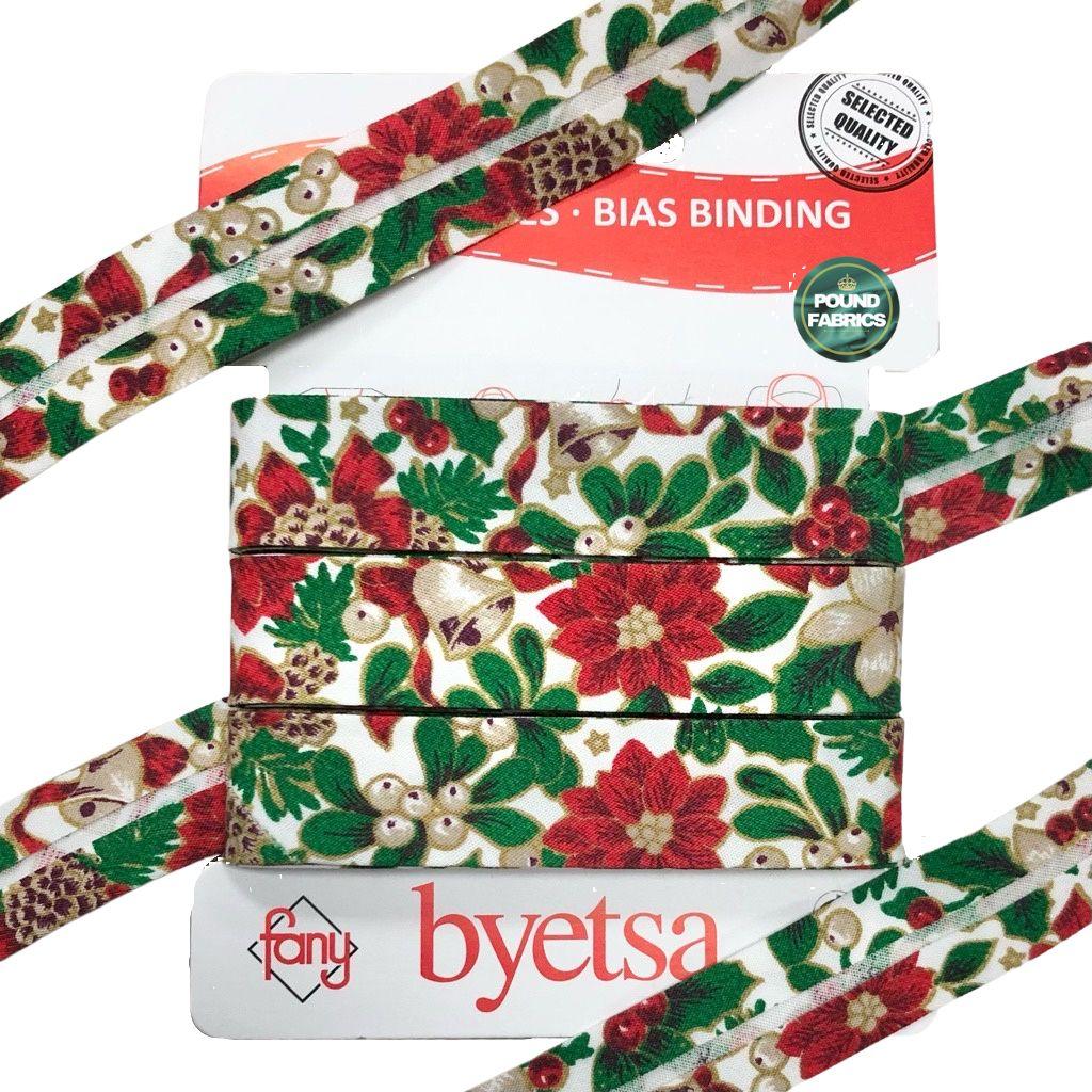 Holly & Flowers Cotton Bias Binding Tape - 5 metres - 18mm wide - available now at the UK's lowest price!