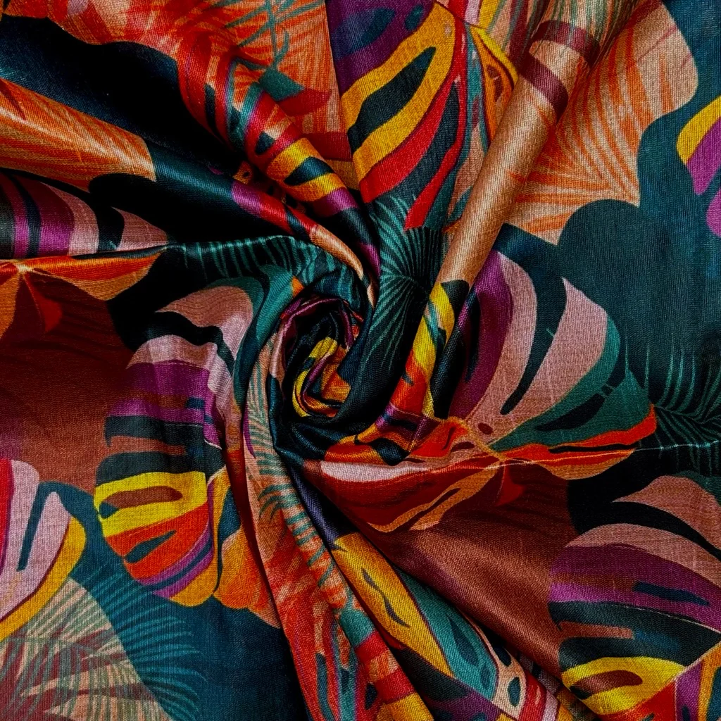 This lightweight fabric features a vibrant leaves print. It has a beautiful drape and a soft yet slightly textured feel, mimicking the natural elegance of real silk. The blend of bamboo and viscose in this fabric gives it a silky smooth finish with a subtle sheen, while also enhancing breathability and comfort.