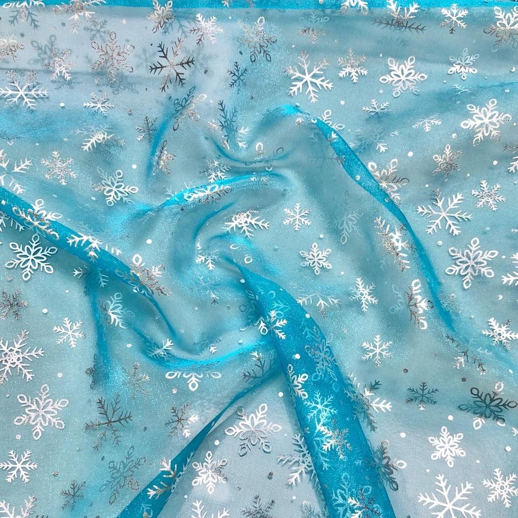 A lightweight organza fabric featuring a shimmering snowflake print. Suitable for a range of costume making and decorating projects as well as displays and ice cool princess costumes! Available in 2 colours.