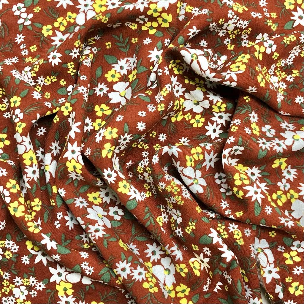 A viscose challis fabric featuring a floral print. Suitable for tops, dresses, skirts, accessories and more. Available in 2 colours.